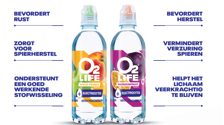 Met het succes van O2Life en O2Life Blue breidt O2Life zijn assortiment uit met een nieuwe functionele lijn: O2Life Electrolytes. Verkrijgbaar in de frisse smaken Apple Peach en Passionfruit